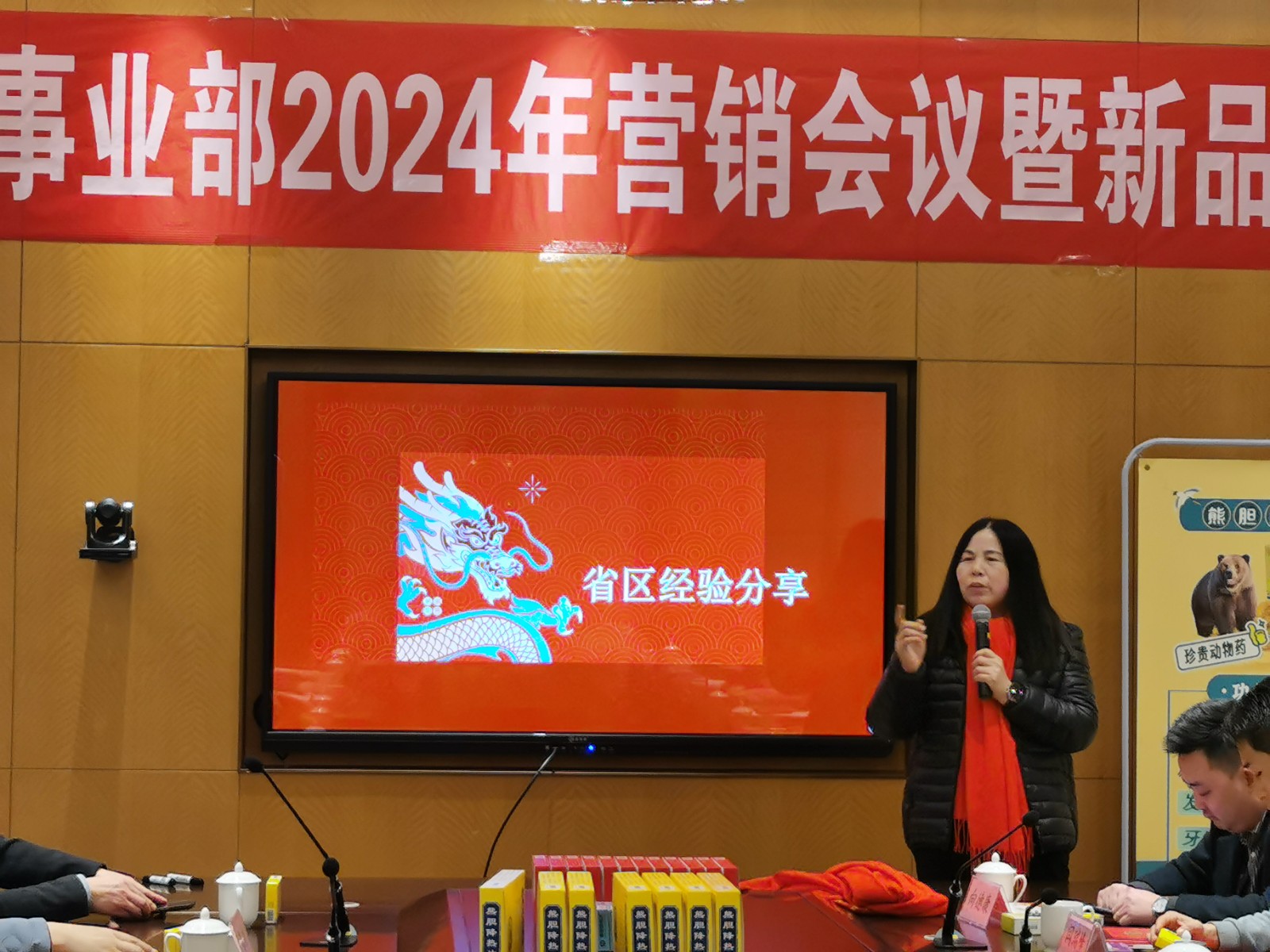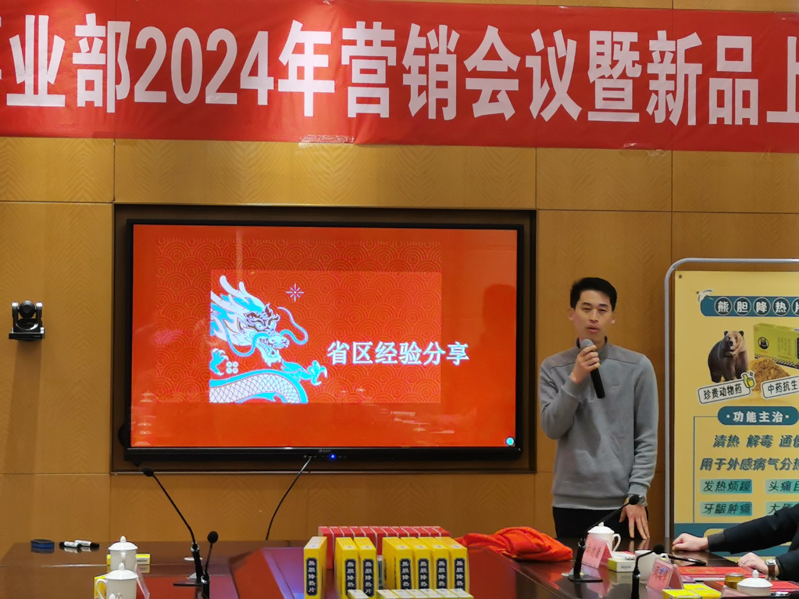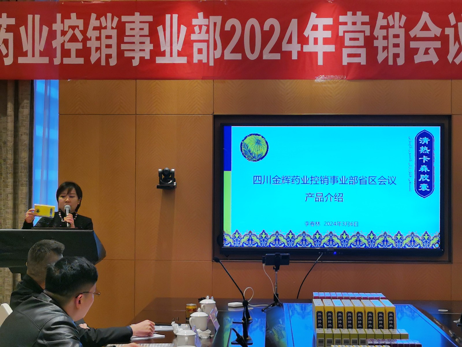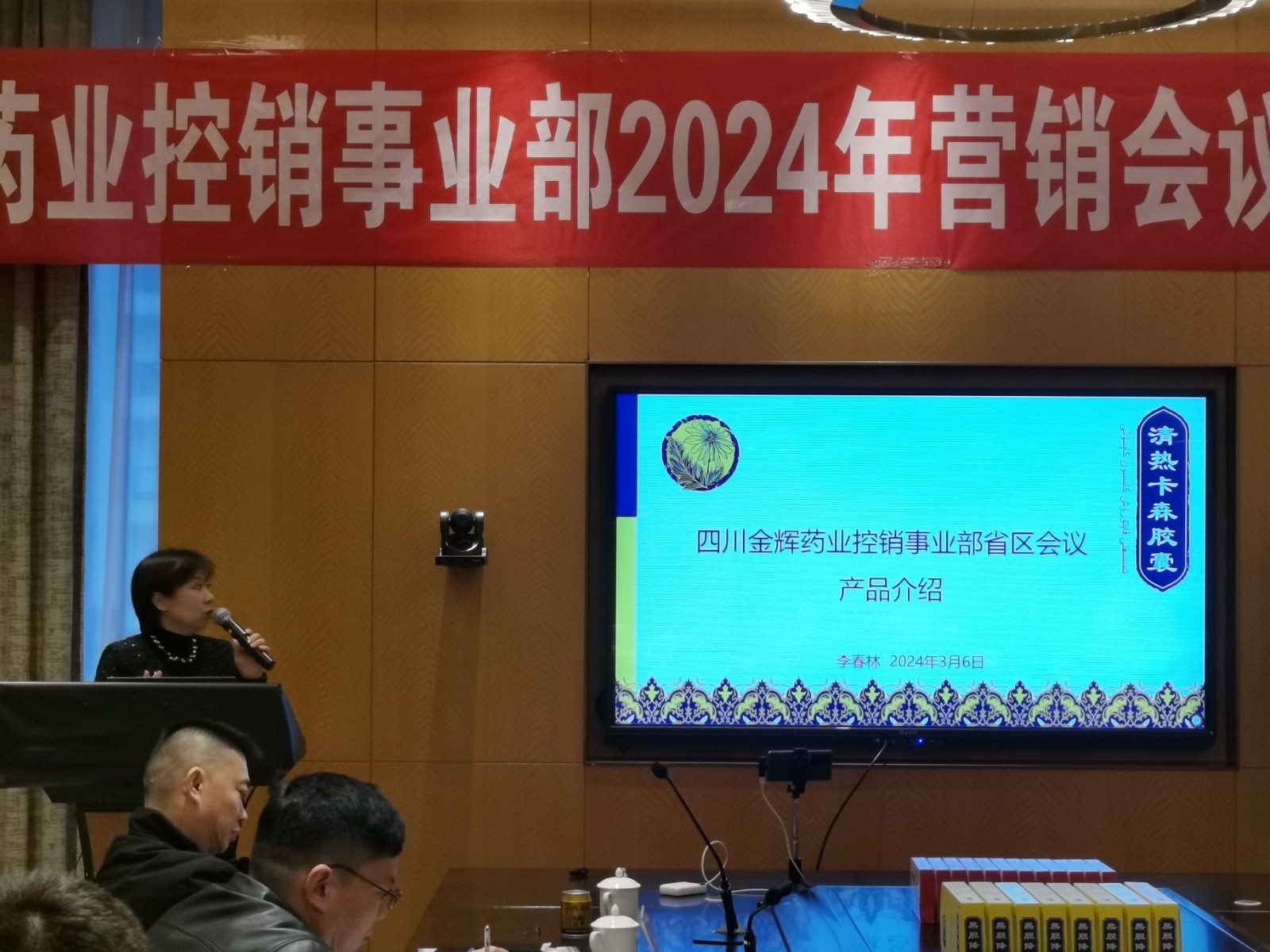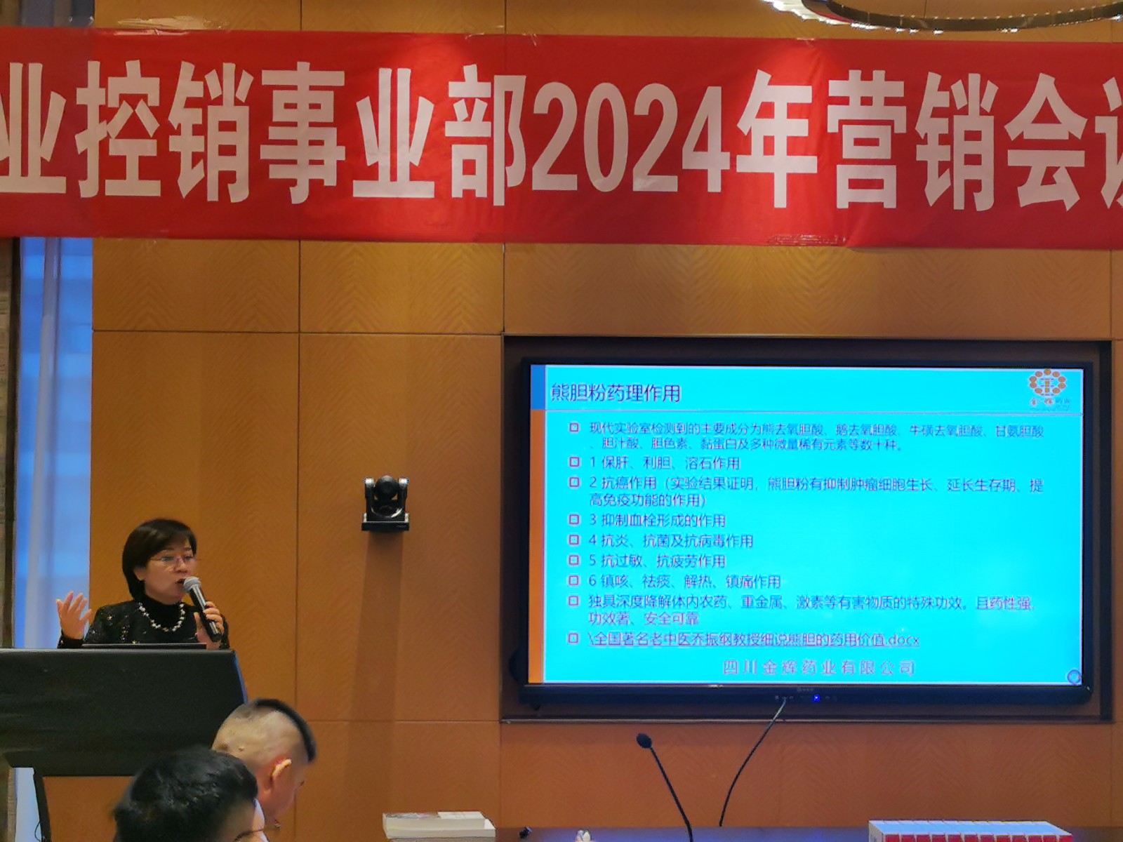 ↑副總經(jīng)理李春林新品介紹:清熱卡森、二丁片,熊膽粉