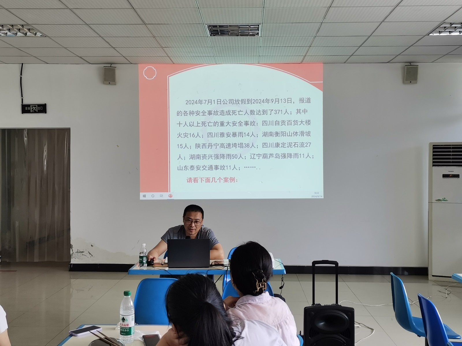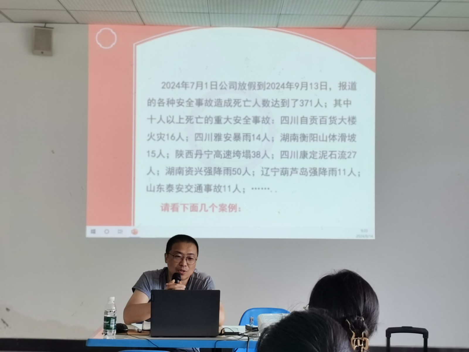 2024年9月14日上午,公司舉行了復(fù)工前安全培訓(xùn)。培訓(xùn)內(nèi)容為職工上下班交通安全、生產(chǎn)安全以及自然災(zāi)害應(yīng)急預(yù)案。通過本次培訓(xùn),培養(yǎng)了職工良好的安全意識(shí),加強(qiáng)了公司和職工對突發(fā)災(zāi)難事件的應(yīng)急處理能力。